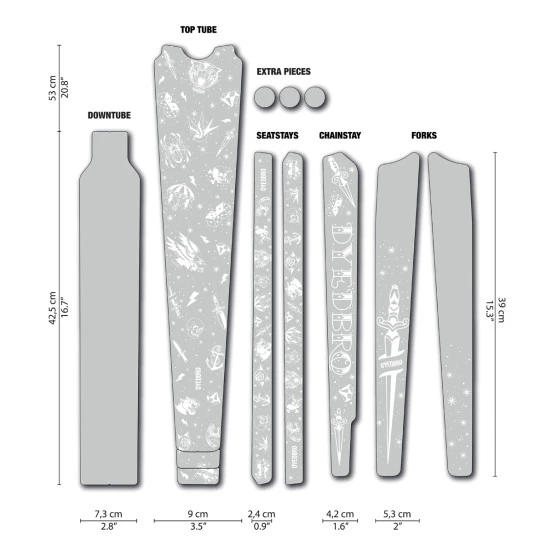 AdhĂ©sifs de protection vinyl transparent de 300 micron d’Ă©paisseur, imprimĂ©s avec encres latex, prĂ©dĂ©coupĂ©s pour s’adapter aux diffĂ©rents cadres vĂ©los. Il peut ĂŞtre nĂ©cessaire de recouper certaines pièces avec une paire de ciseaux ou un cutter pour une parfaite adaptation au support.Â