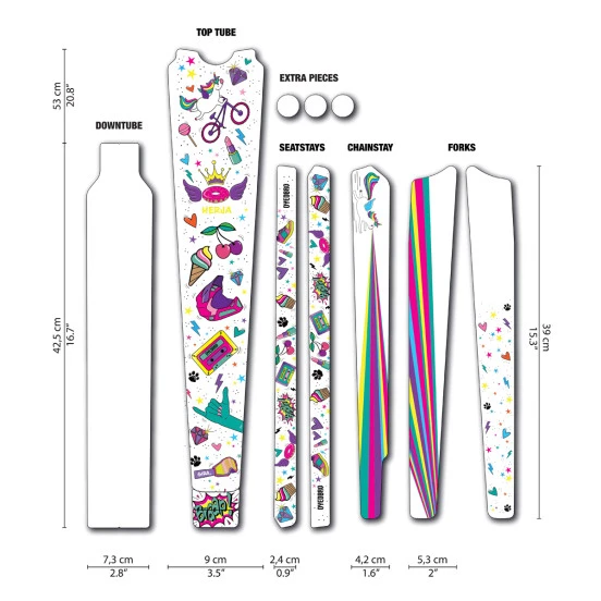 AdhĂ©sifs de protection vinyl transparent de 300 micron d’Ă©paisseur, imprimĂ©s avec encres latex, prĂ©dĂ©coupĂ©s pour s’adapter aux diffĂ©rents cadres vĂ©los. Il peut ĂŞtre nĂ©cessaire de recouper certaines pièces avec une paire de ciseaux ou un cutter pour une parfaite adaptation au support.Â