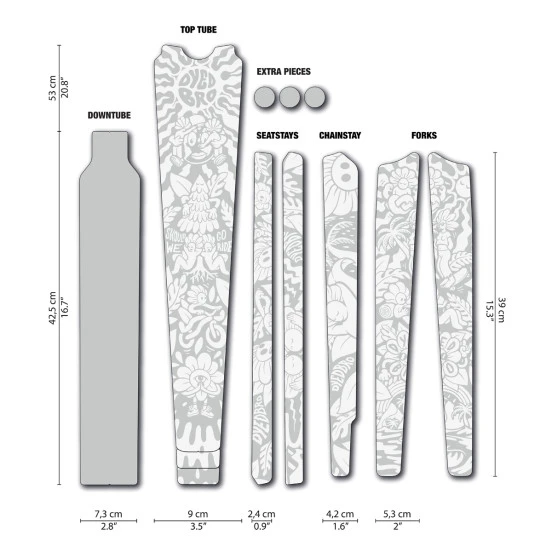 AdhĂ©sifs de protection vinyl transparent de 300 micron d’Ă©paisseur, imprimĂ©s avec encres latex, prĂ©dĂ©coupĂ©s pour s’adapter aux diffĂ©rents cadres vĂ©los. Il peut ĂŞtre nĂ©cessaire de recouper certaines pièces avec une paire de ciseaux ou un cutter pour une parfaite adaptation au support.Â