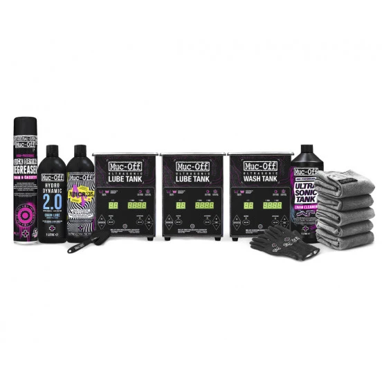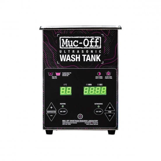 Un bac à ultrason permet de nettoyer des pièces sales sans effort, dans les moindres recoins et avec une efficacité bluffante. Le bac à ultrason agite le liquide qui «vibre» très vite (env 35kHz) et crée des microbulles. Quand on plonge la pièce à nettoyer dans le bac, ces micro bulles implosent contre la pièce. Les micro ondes de choc ainsi créées décollent les moindres saletés attachées à la pièce, dans les moindres recoins. Muc-Off développe un concept unique de nettoyage et lubrification pour les chaines par exemple. Un bac sert au nettoyage et les deux autres à la lubrification.